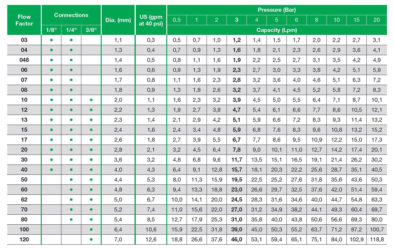 Описание:Форсунки серии F производят плоское веерообразное распыление при углах от 5 до 110°, измеряемом при 3 bar. Углы распыления, как правило, увеличиваются при увеличении давления как показано в таблице расходов.